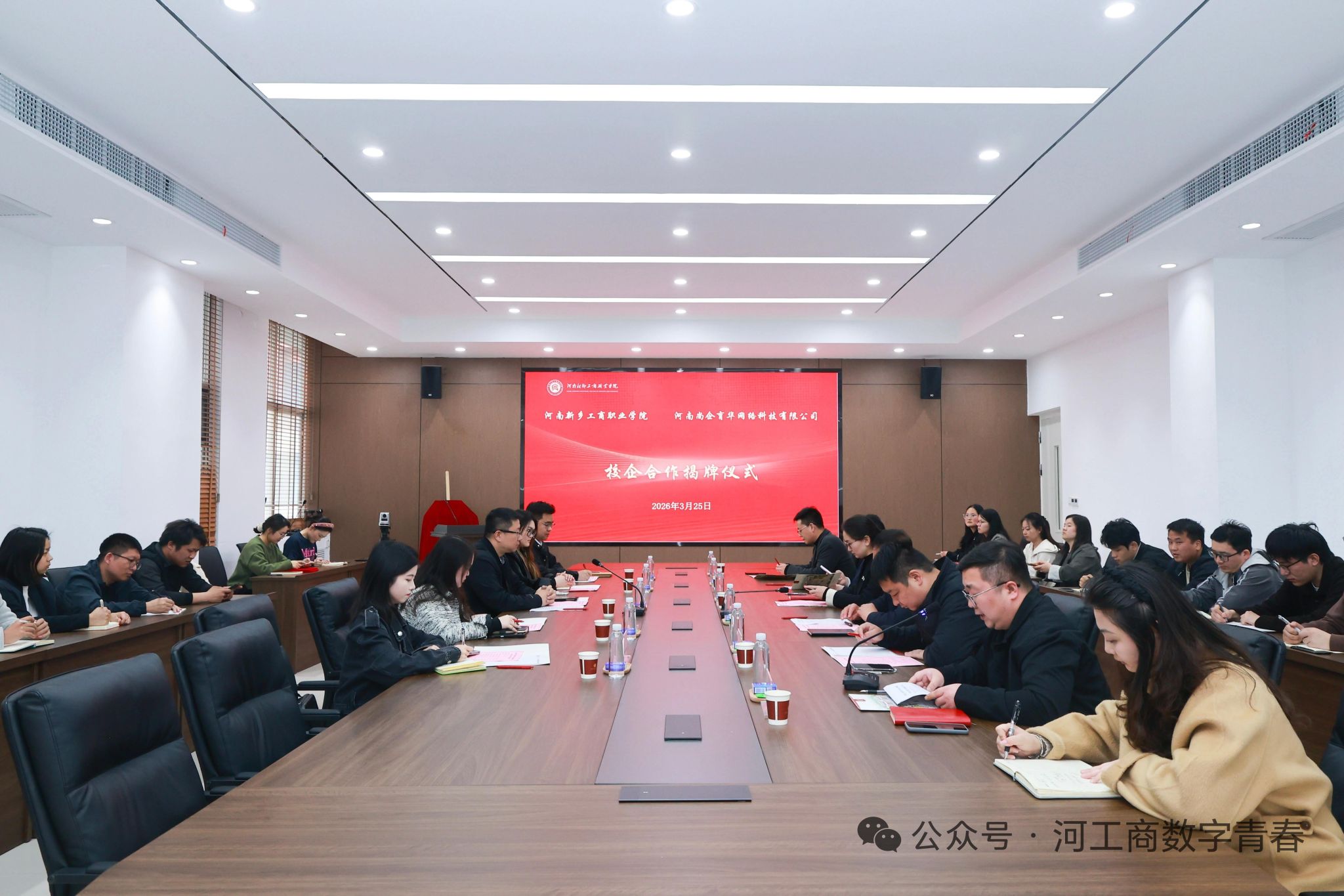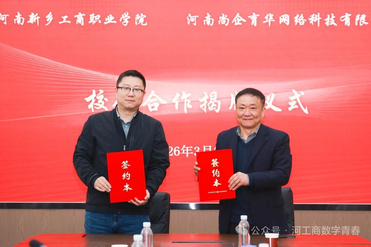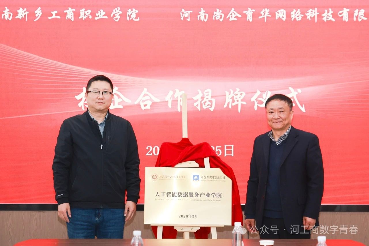 春和景明,聚力前行。3月25日下午,河南新乡工商职业学院与河南尚企育华网络科技有限公司共建产业学院签约暨揭牌仪式在教学楼7A212会议室隆重举行。此次签约揭牌,既是我校深化产教融合、精准对接数字产业发展需求的关键落子,也是校企双方携手赋能区域数字经济人才培养的务实之举。